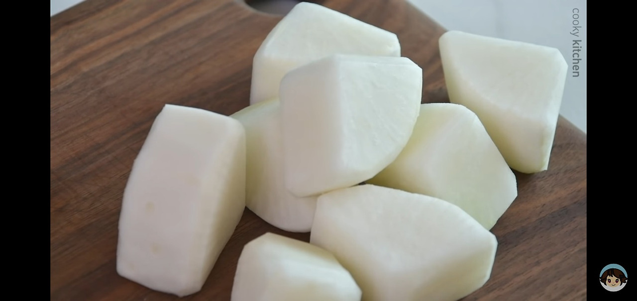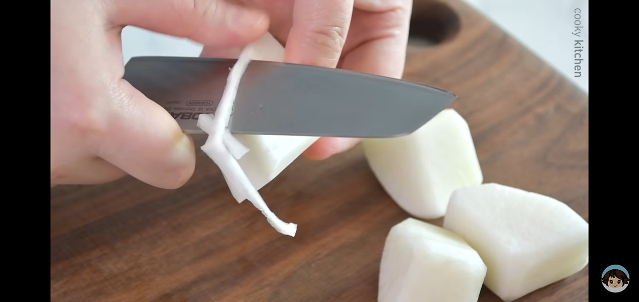 무 300g은 큰 크기로 잘라서 모서리를 둥글게 깎아주면, 부서지지 않고 보기 좋은 둥근 모양의 무가 완성돼요.