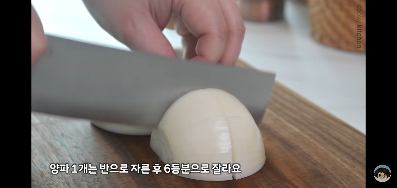 양파는 반으로 자른 뒤, 6등분으로 썰어 주고, 표고버섯 3~4개도 적당한 두께로 썰어 주세요.