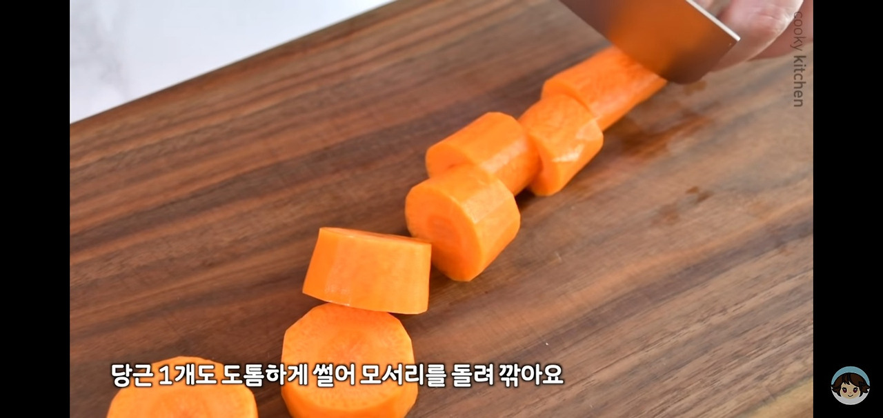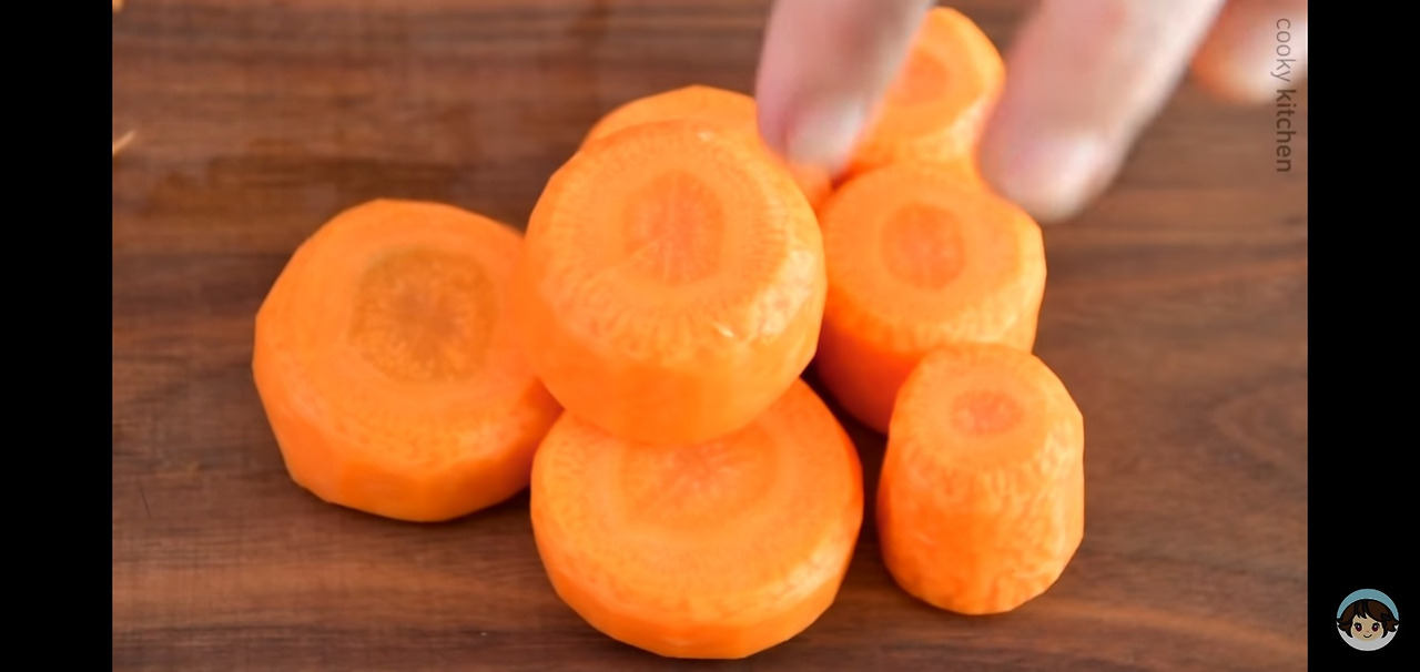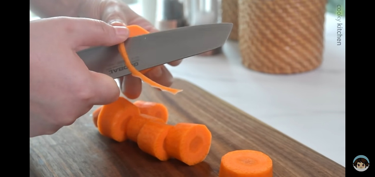 당근은 적당한 두께로 썰고, 모서리를 둥글게 깎아 주세요.