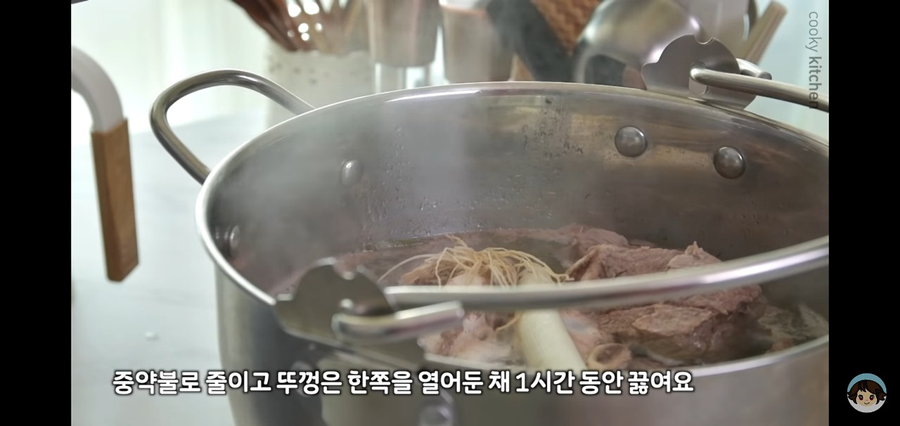 그다음, 불을 중약불로 낮추고 뚜껑을 살짝 열어 둔 채로 한 시간 정도 끓여줍니다.
