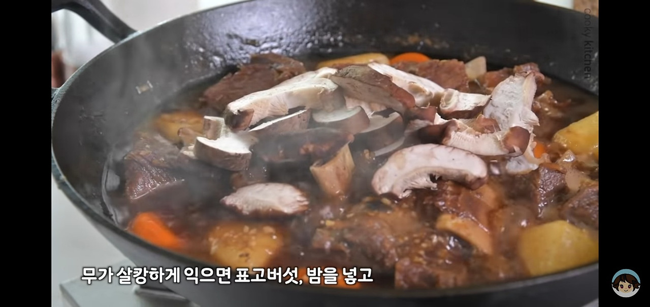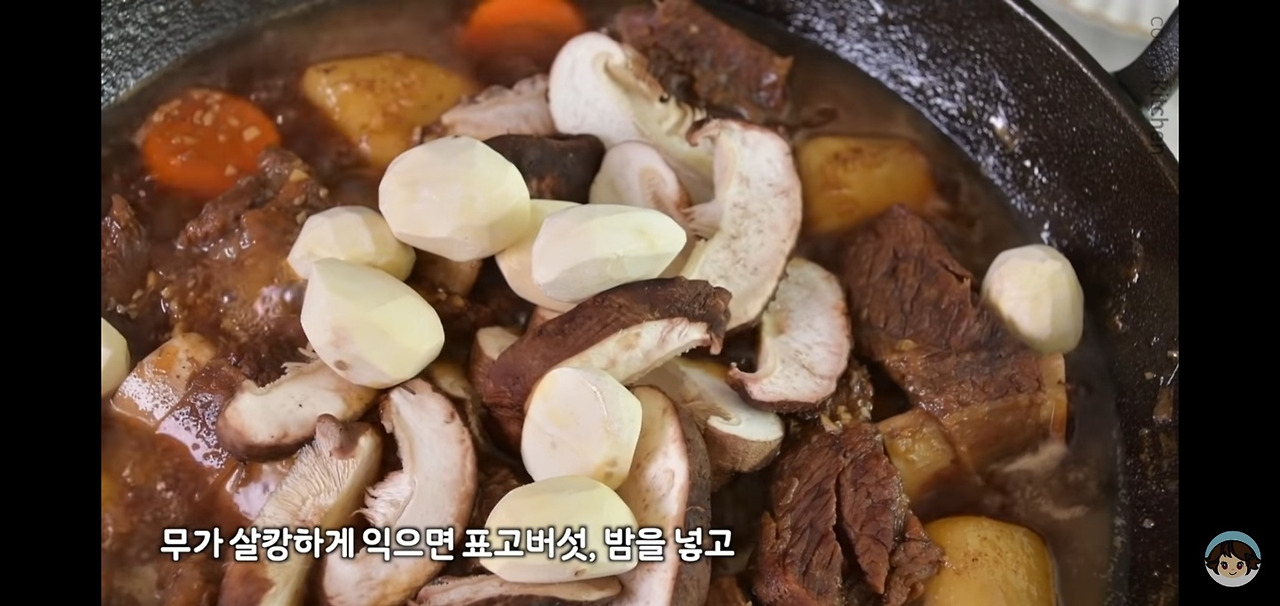 10분 정도 지나 무가 살짝 익으면 표고버섯과 밤을 넣어 주세요.