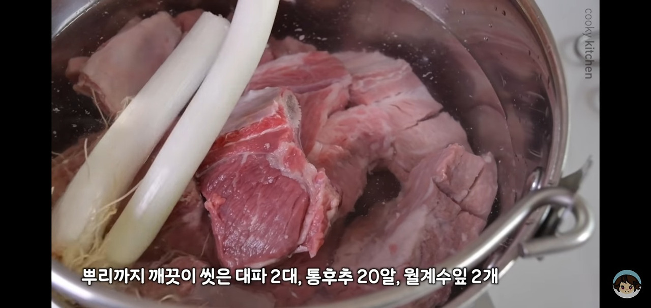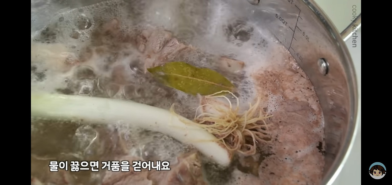 핏물을 제거하고 깨끗이 헹군 소갈비를 냄비에 넣은 뒤, 깨끗하게 손질한 대파 두 대, 통후추 스무 알, 월계수 잎 두 장을 함께 넣고 끓여 주세요.