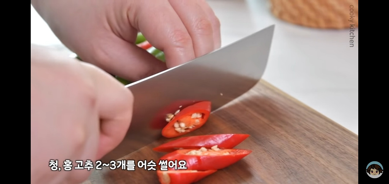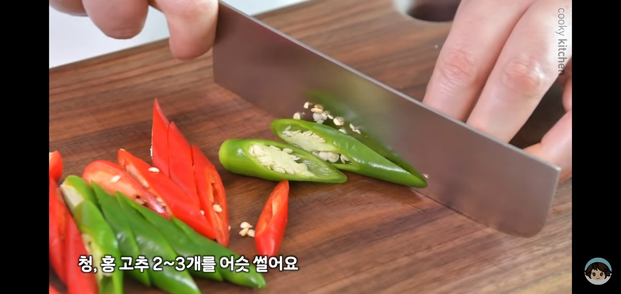 청양고추와 홍고추 2~3개씩은 적당한 크기로 썰어 주세요.