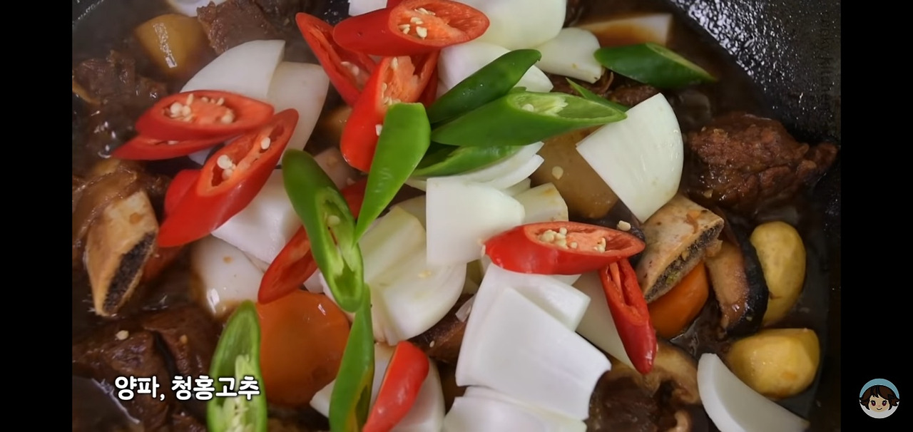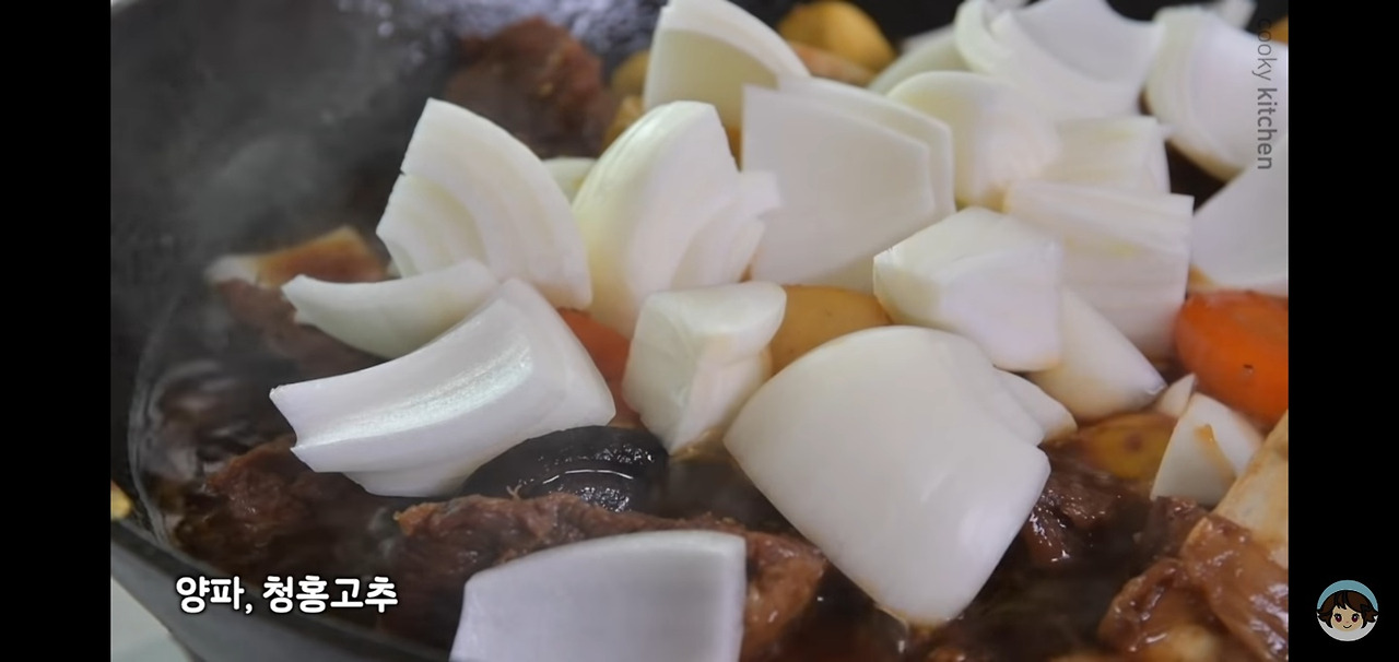 이 상태로 5분간 더 졸인 후, 양파와 청홍고추를 넣어 주세요.