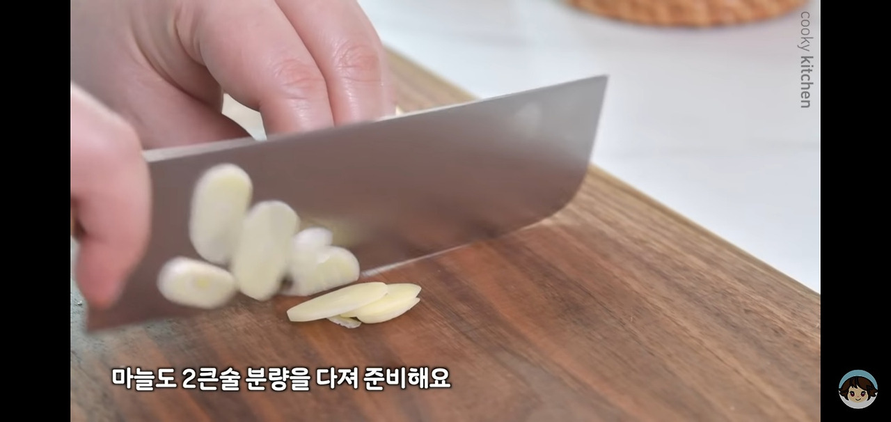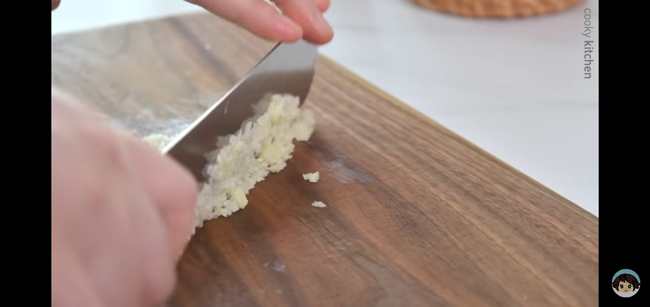 다진 마늘 2스푼이 없다면, 이렇게 직접 마늘을 잘게 다져서 사용하면 돼요. 사실, 요리 직전에 다진 마늘을 넣으면 더 맛있답니다!