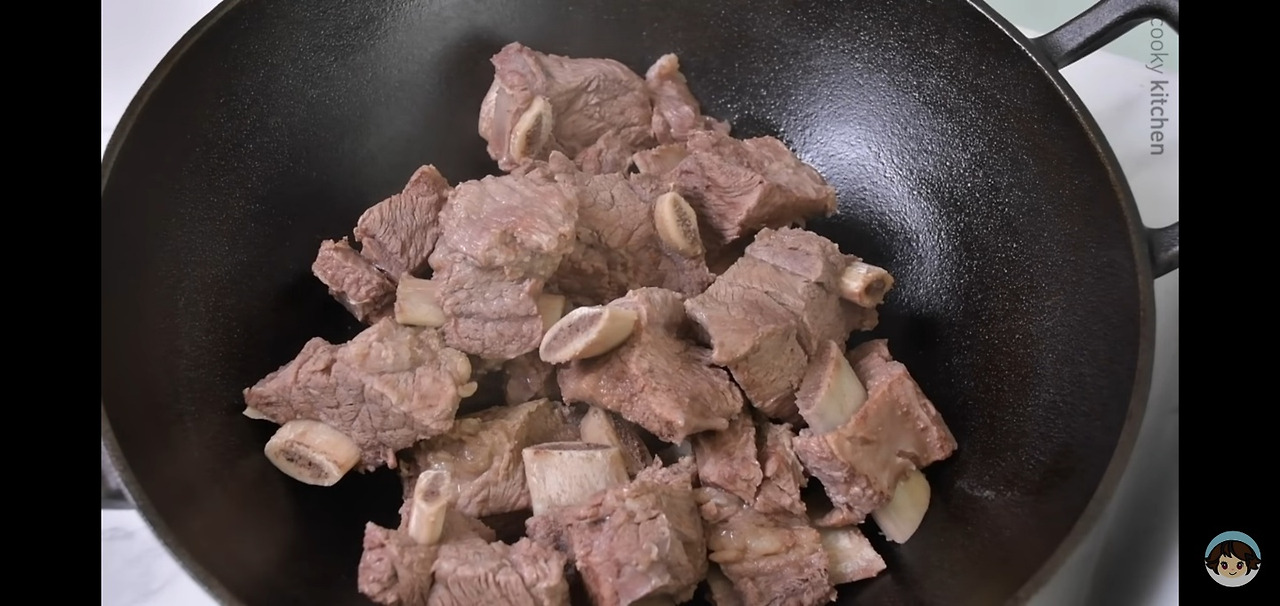 한 시간 동안 푹 익힌 소갈비를 물에 한번 헹군 후, 조림을 할 냄비에 넣어 주세요.