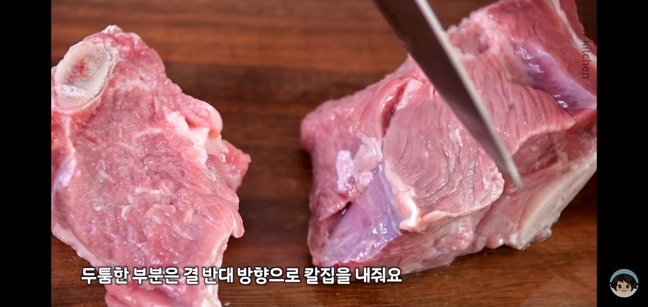 소갈비는 불필요한 지방을 잘라내고, 결과 반대 방향으로 칼집을 넣어 주세요.