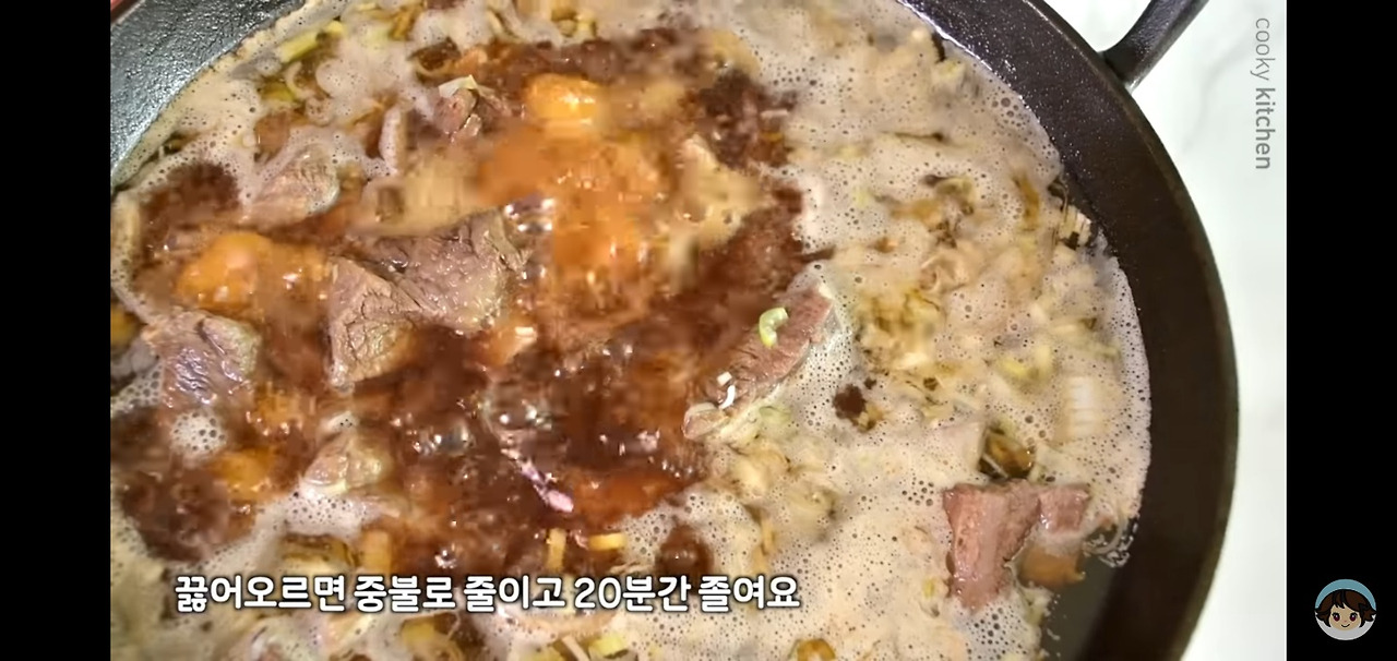 물이 끓어오르면 중불로 줄인 후, 약 20분 정도 졸여 주세요.
