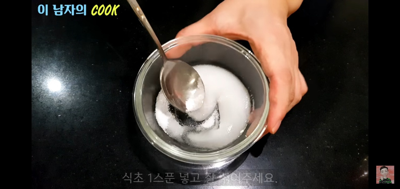 맛소금 한 스푼, 설탕 한 스푼, 식초 한 스푼을 넣고 잘 섞어주세요.