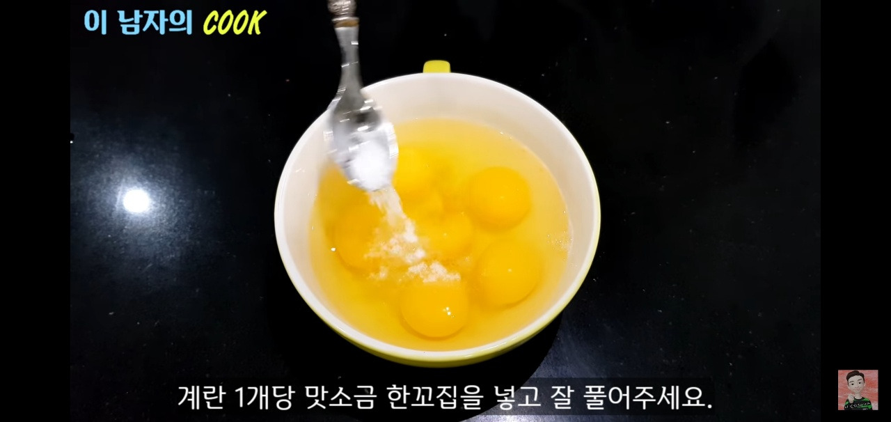 계란 한 개당 맛소금 한 꼬집 정도를 기준으로, 계란 6개에 맛소금 6꼬집을 넣고 골고루 풀어주세요.