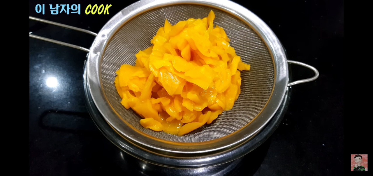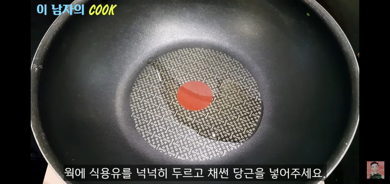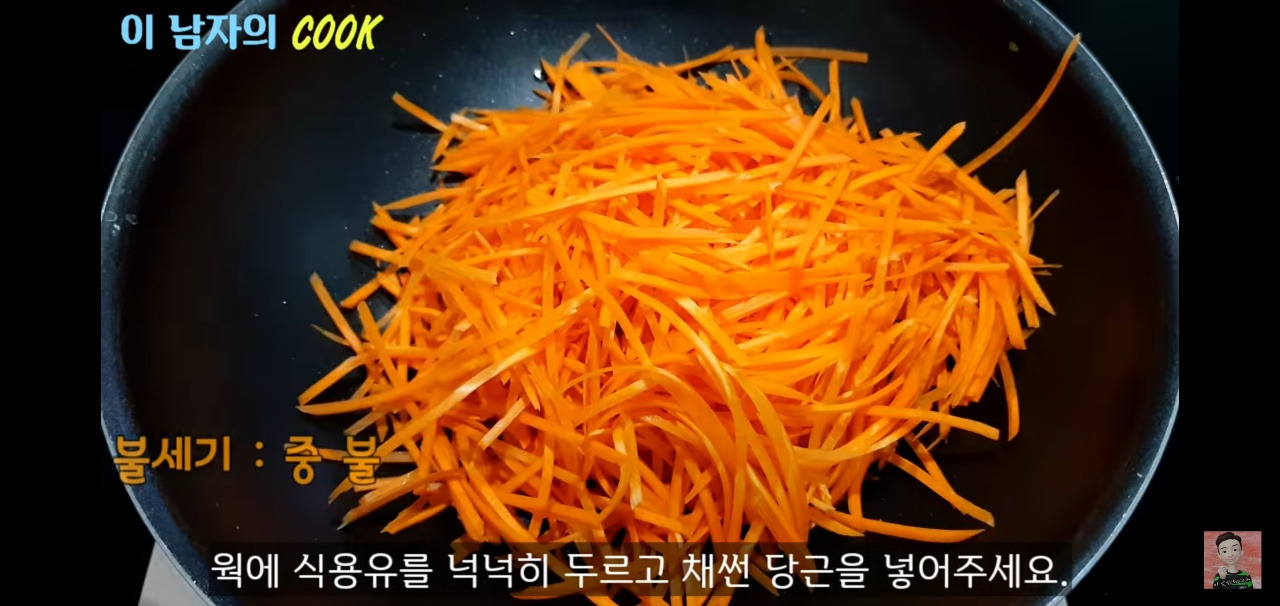 당근은 채칼을 사용해 얇게 썰어주시고, 팬에 식용유를 두른 후 중간 불에서 살짝 익혀주세요.