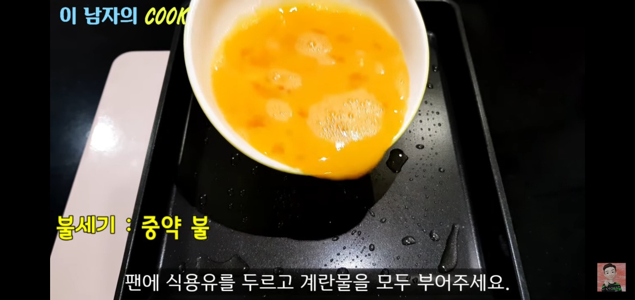 그다음, 중간 불로 달궈진 팬에 기름을 살짝 두른 후 계란물을 부어주세요.