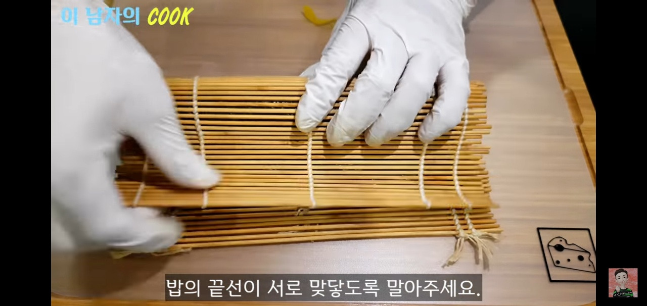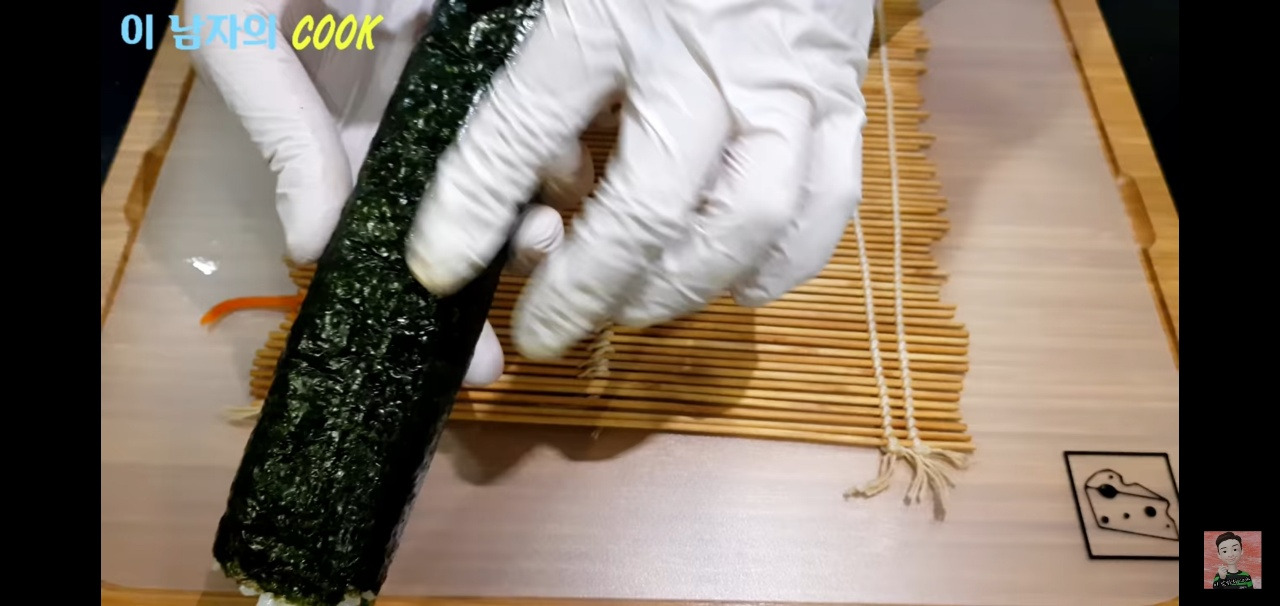 마지막으로 김의 끝부분을 잘 붙여주면, 이렇게 깔끔하게 김밥이 완성돼요.