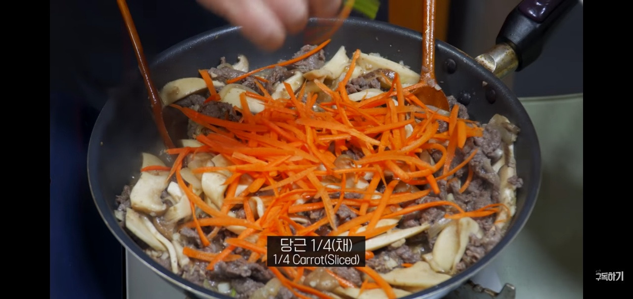 이렇게 잘 볶아주다가, 당근 1/4개를 채썰어 함께 넣고 익혀주세요.