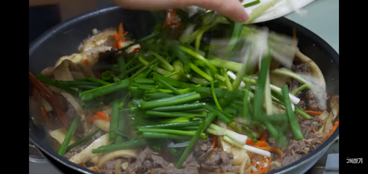 그다음, 준비해둔 쪽파를 넣고 한 번 더 익히면 오늘의 버섯 불고기 레시피가 완성됩니다!