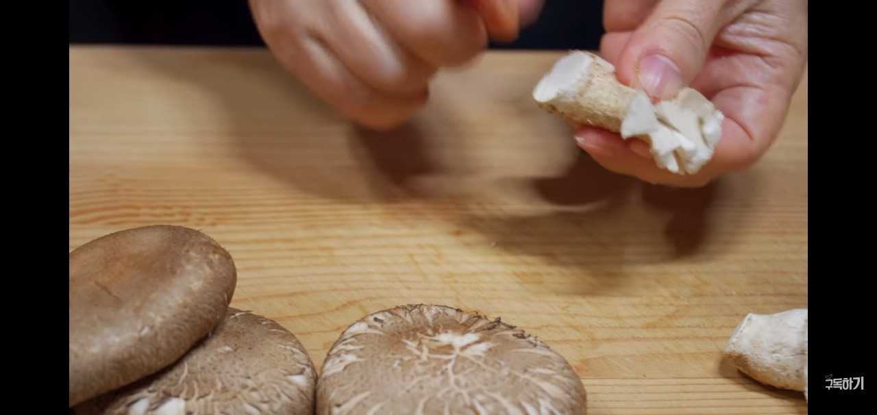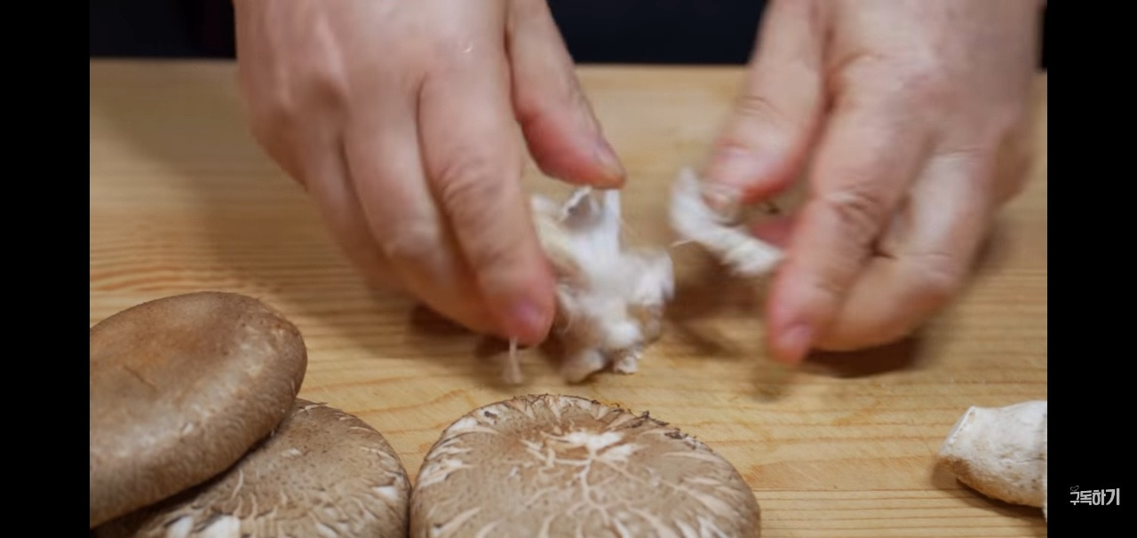 표고버섯 3개는 밑둥 부분에 흙이 묻어 있을 수 있으니, 칼로 살짝 잘라내고, 키친타올로 부드럽게 닦아서 이물질을 제거해 주세요.