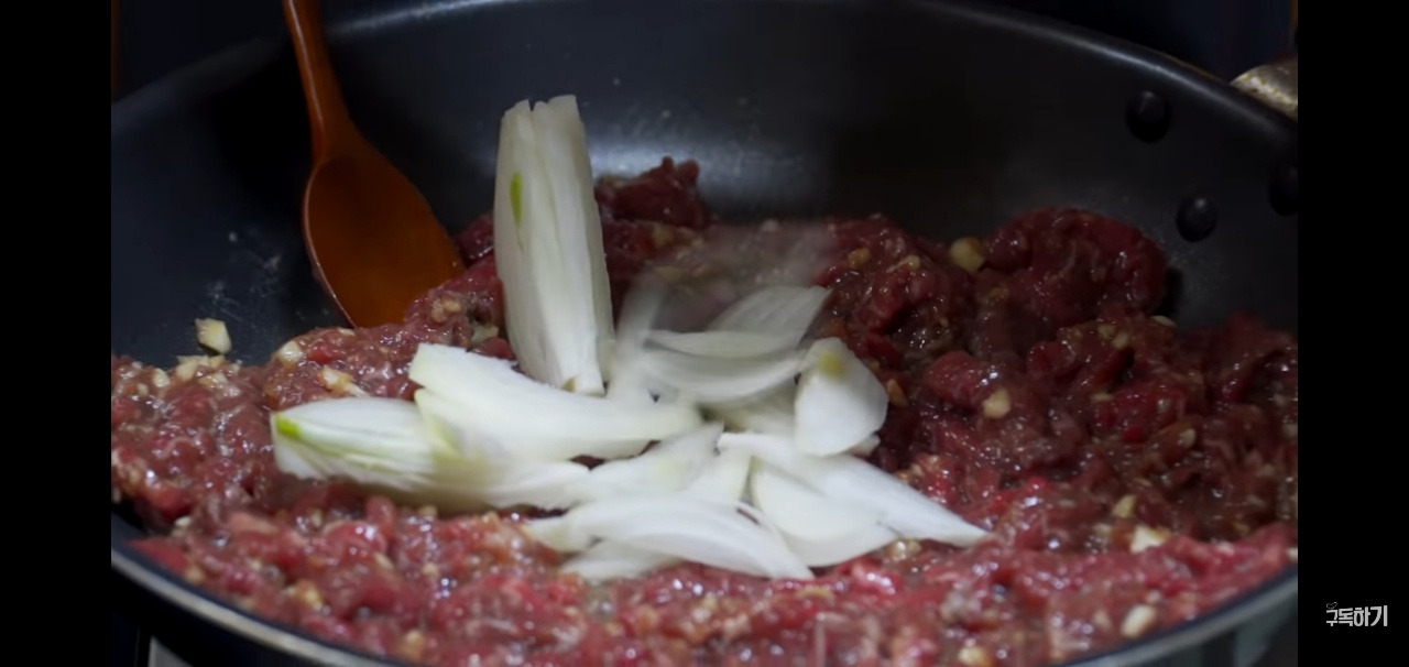 그다음, 달궈진 팬에 고기와 양파를 넣고 잘 볶아주세요.