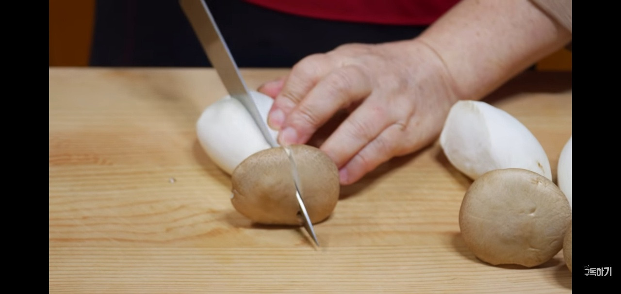 버섯의 머리 부분도 옆으로 예쁘게 썰어주세요.