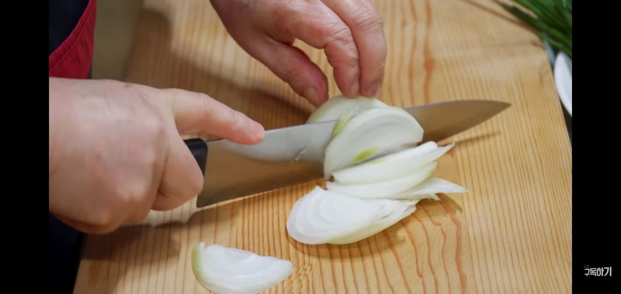 양파 반 개는 얇게 슬라이스하여 썰어주세요.