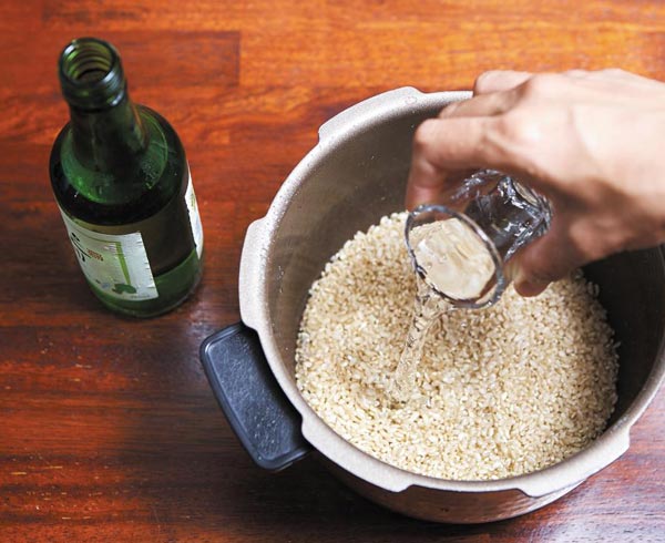 2. 이때, 현미밥의 식감을 더욱 부드럽게 해주는 비법으로 소주를 살짝 넣어주세요. 보통 쌀 1컵당 소주 한 잔 정도가 적당하다고 해요.