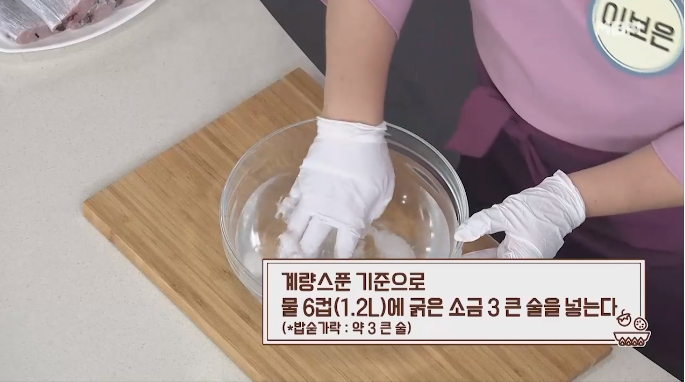 2. 물 1.2L에 굵은 소금 약 3큰술을 넣어 잘 녹여 소금물을 만들어 주세요.
