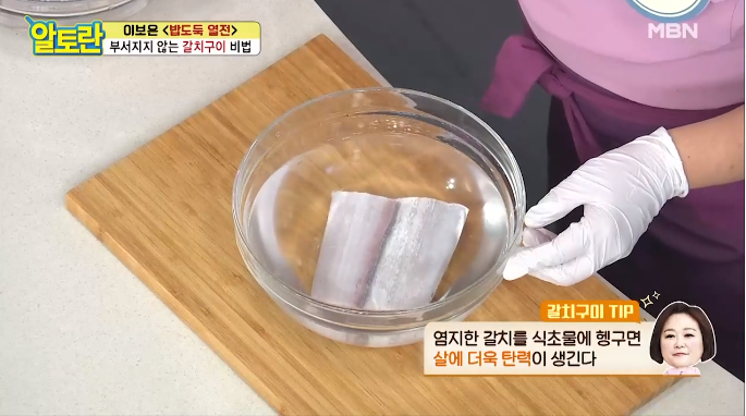 갈치구이를 더욱 맛있게 만들기 위해 식초물을 사용하는데요. 염지한 갈치를 식초물에 헹궈주면 살이 탄력 있어지고 식감이 한층 더 좋아진답니다.