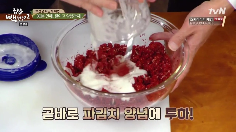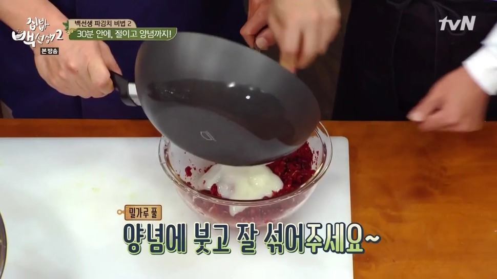 9. 쪽파를 절일 때 사용했던 액젓은 버리지 말고 양념에 넣어 골고루 섞어 주세요. 그런 다음, 충분히 절여진 쪽파에 양념을 고루 묻혀가며 발라주시면 됩니다.