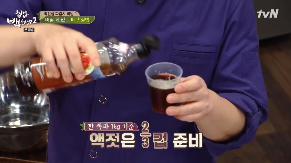 2. 넉넉한 크기의 그릇을 준비한 뒤, 종이컵 기준으로 액젓 2/3컵을 담아 주세요. 그런 다음, 손질한 쪽파를 그릇에 넣고 뿌리 부분 위주로 액젓을 골고루 뿌려 주세요.