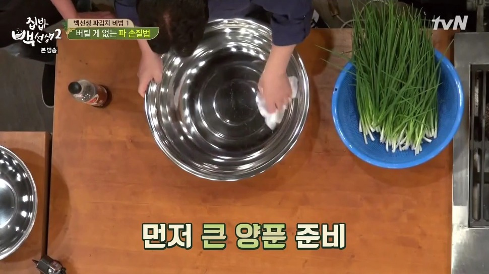 1. 먼저 쪽파를 깨끗이 손질한 뒤 흐르는 물에 잘 씻어 주세요. 물기가 충분히 빠질 수 있도록 체에 받쳐두면 좋아요. 특히 뿌리 쪽 흰 부분이 향이 가장 진하다고 하니, 너무 많이 잘라내지 않도록 주의해 주세요. 그리고 시든 잎이나 끝부분은 깔끔하게 정리해 주시면 됩니다.