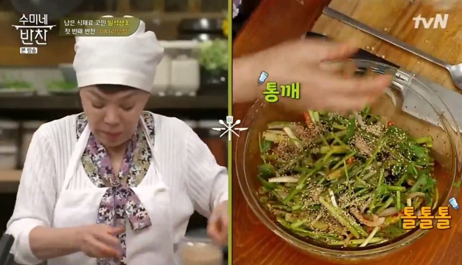 15. 마지막으로 통깨를 솔솔 뿌린 뒤 예쁜 접시에 담으면, 김수미 스타일의 맛있는 미나리무침이 완성돼요.