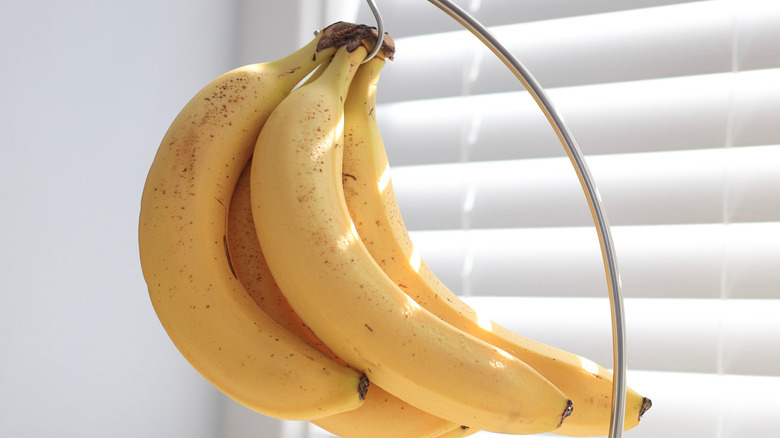 ‘바나나 속이기’라는 재미있는 보관 방법이 있는데요, 바로 옷걸이를 활용해서 바나나를 매달아 두는 방식이에요. 바나나 꼭지 부분에서는 ‘에틸렌’이라는 숙성을 촉진하는 성분이 활발하게 나오기 때문에, 이 부분을 위쪽으로 향하게 걸어두면 바나나가 나무에 달려 있는 줄 알고 숙성 속도가 느려진다고 해요. 덕분에 노란색 상태를 조금 더 오래 유지할 수 있답니다.