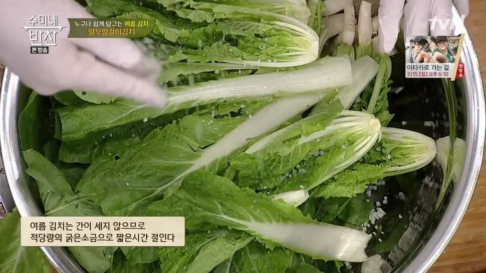그리고 열무는 잎보다 뿌리 부분이 더 단단해서 절이는 데 시간이 좀 더 걸린다고 해요. 그래서 소금을 뿌릴 때는 뿌리 쪽부터 먼저 뿌려주시고, 그다음 줄기와 잎 순서대로 절여주시는 게 훨씬 좋아요.