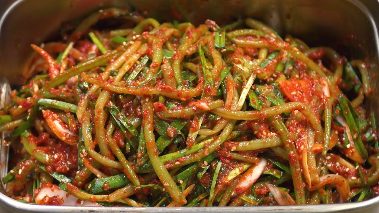 고구마순 김치: 신선한 고구마순에 젓갈과 각종 양념을 버무려 발효시키면 아삭하고 깊은 맛의 김치가 완성돼요.