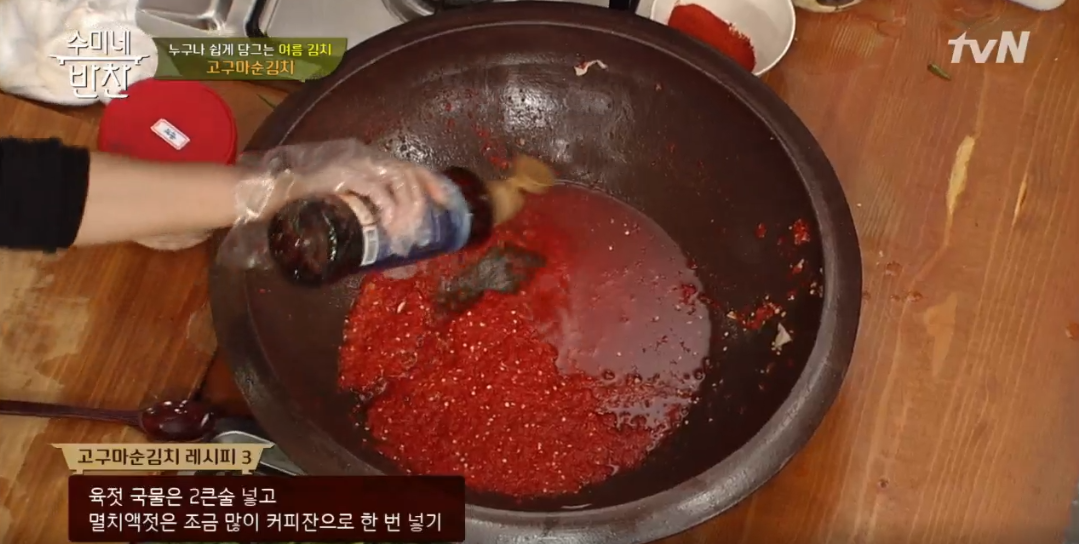 4. 새우젓은 밥숟가락으로 두 술 정도, 멸치액젓은 작은 커피잔 한 컵 분량으로 넣어주시면 맛이 잘 어우러져요.