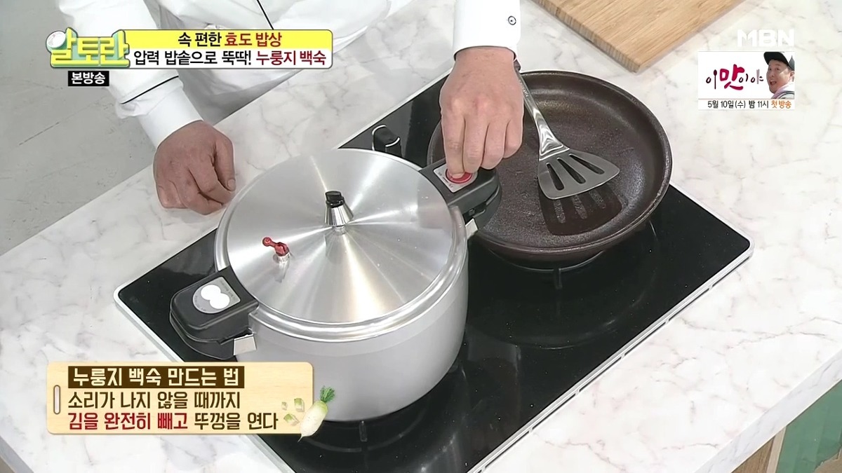 16. 마지막 단계에서는 뜸을 들이지 말고 바로 추를 젖혀 김을 빼 주세요. 김이 모두 빠진 후, 바로 뚜껑을 열어주시면 됩니다.