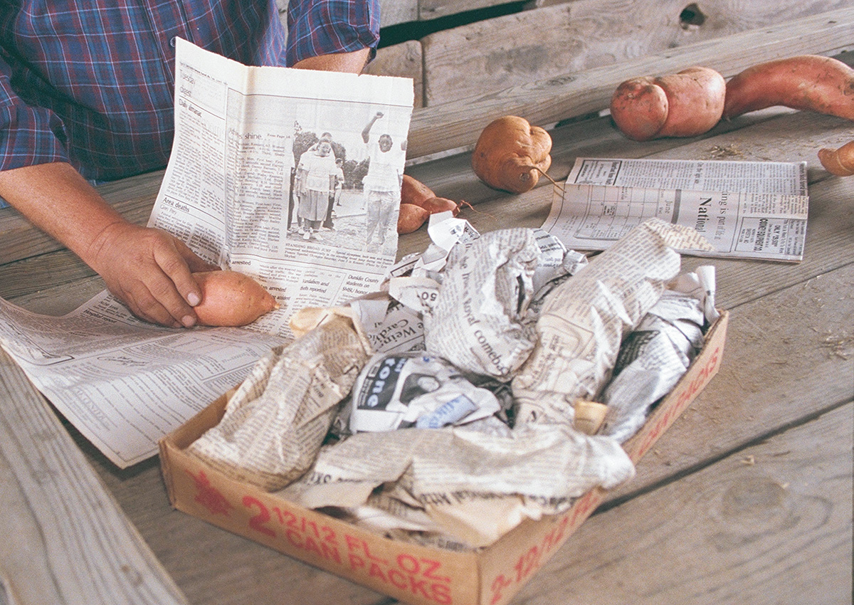 2. 충분히 건조된 후에는 고구마를 하나씩 신문지로 개별 포장해줍니다.