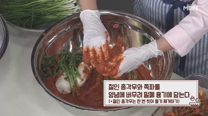 14. 절인 총각무와 쪽파를 양념에 골고루 버무린 뒤, 밀폐용기에 담아주세요.