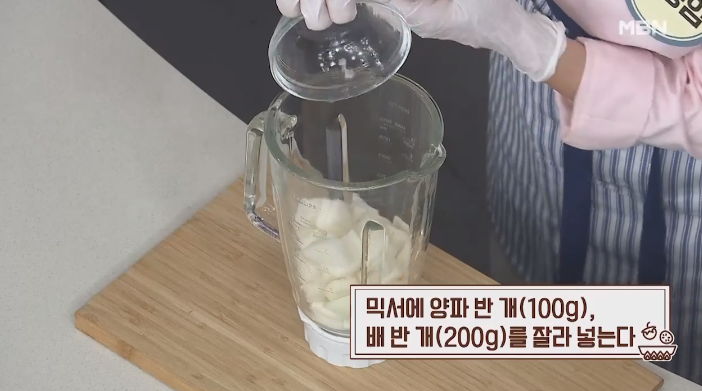 8. 믹서기에 양파 반 개(약 100g)와 배 반 개(약 200g)를 잘라 넣어주세요.