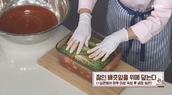 16. 준비한 국물을 밀폐용기에 부은 뒤, 그 위에 절인 배춧잎을 덮어주면 알타리김치 황금레시피 완성입니다.