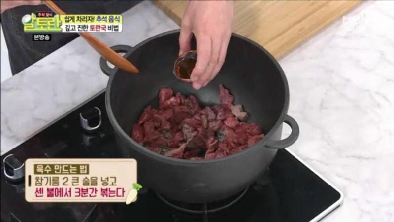 3. 냄비에 먹기 좋게 썬 양지머리 600g을 넣고, 참기름 2큰술을 더한 뒤 센 불에서 3분간 볶아줍니다.
