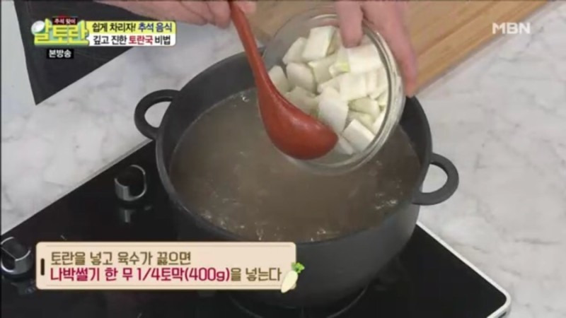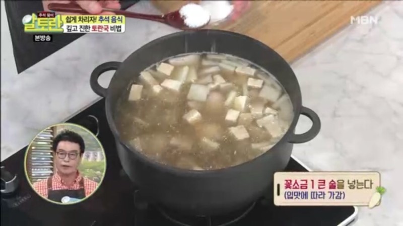 토란국은 오랜 시간 끓여야 깊고 진한 맛이 우러난다고 합니다. 충분히 끓인 뒤, 국간장 2큰술, 멸치액젓 1큰술, 꽃소금 1큰술, 후춧가루를 적당히 넣어 취향에 맞게 간을 맞추면, 토란국을 맛있게 끓이는 김하진 셰프의 황금 레시피가 완성됩니다.