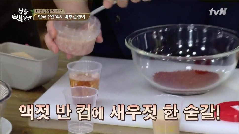 굵은 고춧가루 1컵, 액젓 반 컵, 새우젓 한 스푼을 넣어주세요. 만약 액젓만 있다면 그것만 사용해도 되고, 새우젓만 있다면 그것만 사용해도 괜찮아요. 하지만 김치에는 새우젓이 들어가는 게 더 깊은 맛을 낼 수 있다고 해요.