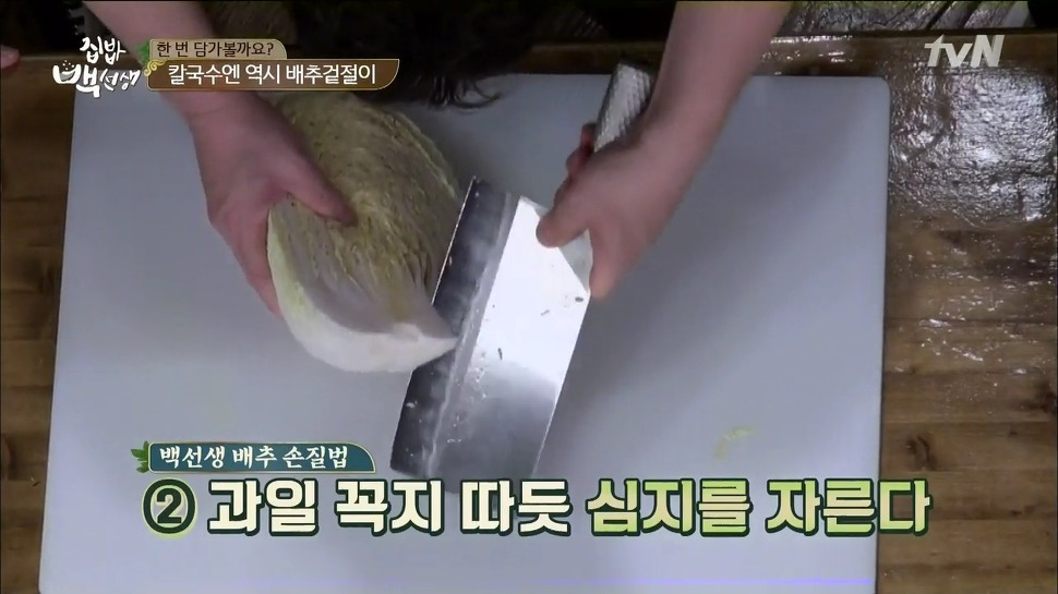 자르는 모양은 크게 중요하지 않지만, 배추의 두꺼운 부분과 얇은 부분이 함께 들어가도록 대각선으로 썰어주는 게 좋아요. 이렇게 하면 식감이 더 살아난다고 해요.