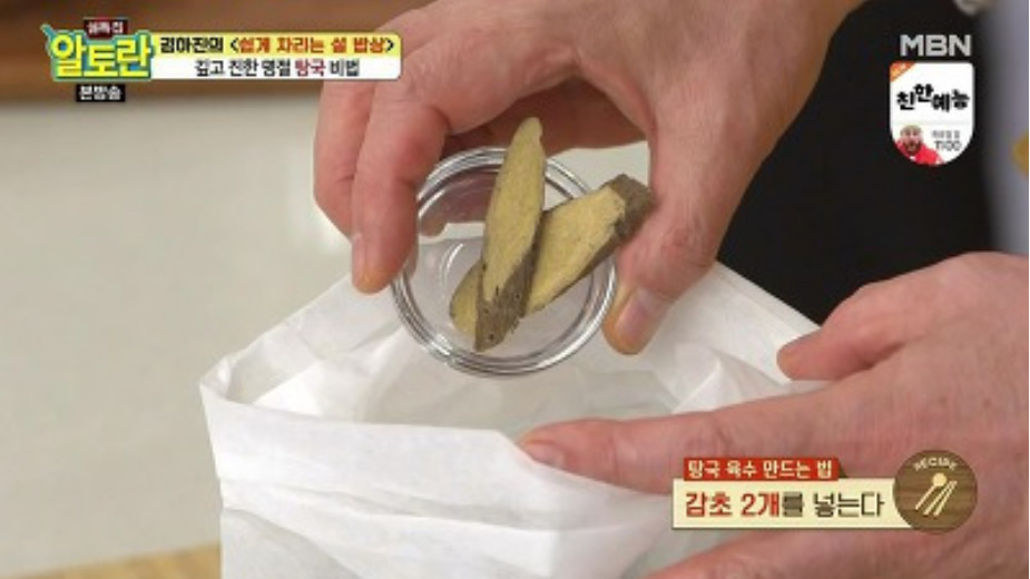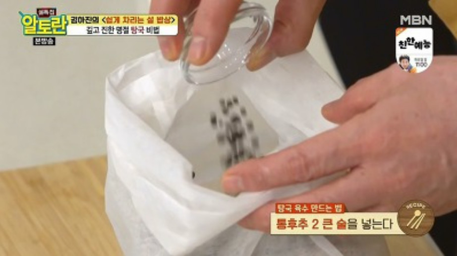 3. 육수 팩에는 집에 있는 다양한 재료를 활용하실 수 있어요. 김하진 셰프의 탕국 레시피에서는 북어 머리 3개, 통후추 2큰술, 청양고추 5개, 감초 2개를 넣어 깊고 진한 맛을 더하셨답니다.