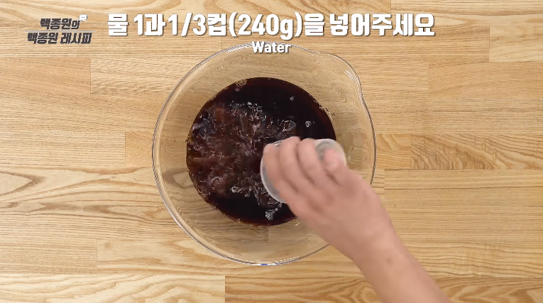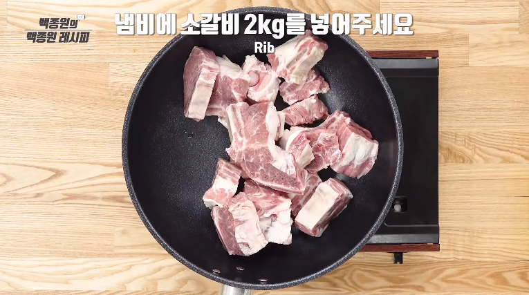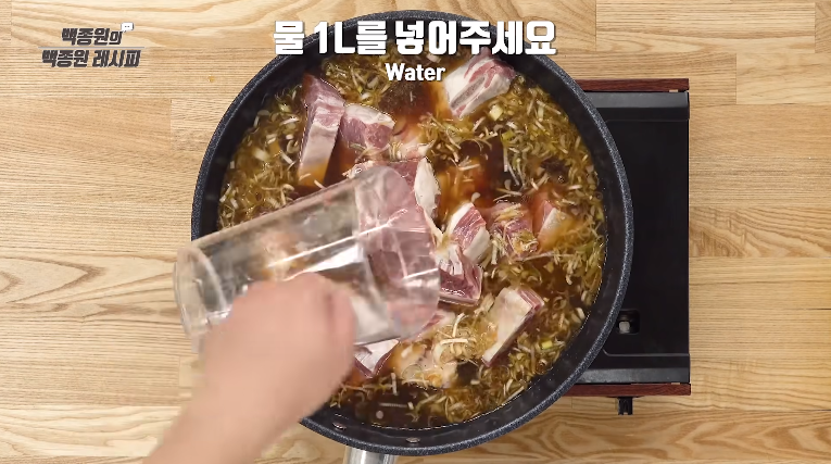 9. 이번 백종원 황금레시피에서는 소갈비를 따로 삶지 않고 한 번에 끓여 조리 과정을 간단하게 했어요. 깨끗이 씻은 소갈비에 갈비 양념과 물 1L를 넣고 끓이다가, 끓기 시작하면 중불로 줄여 약 1시간 정도 끓여주세요.