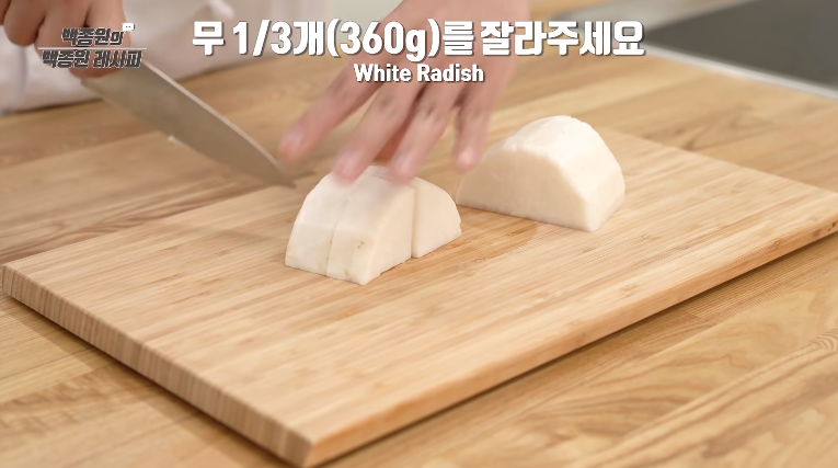 다음으로, 양파는 뿌리를 제거한 뒤 1/4 크기로 자르고, 무는 1/8 크기로 썬 후 모서리를 둥글게 다듬어 주세요. 이때 감자칼을 사용하면 보다 쉽게 둥근 모양을 만들 수 있습니다.