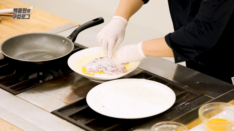 그다음, 달걀물을 골고루 입혀 주세요. 육전을 좀 더 맛있게 만들고 싶다면, 달걀물에 참기름을 약간 넣는 것도 좋은 팁입니다.