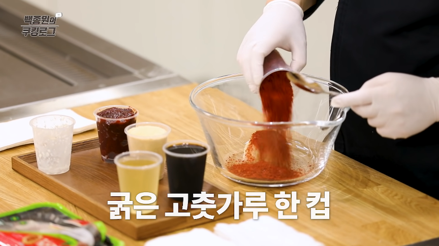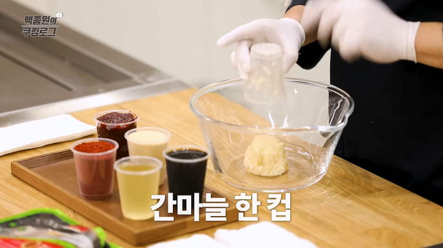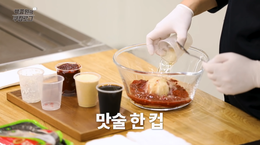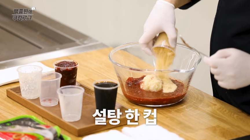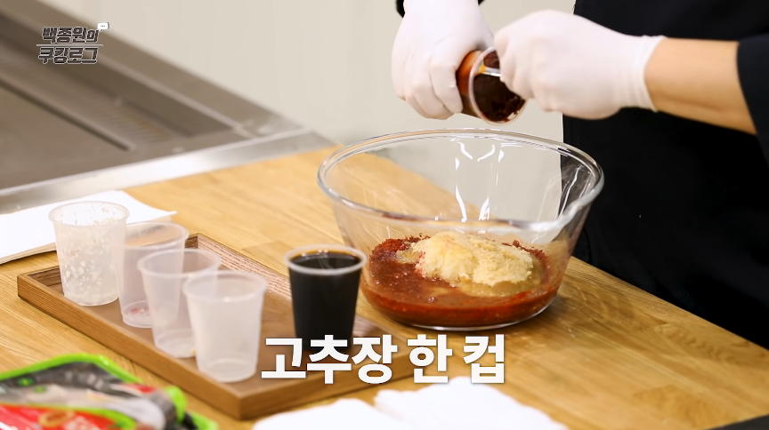 3. 이제 마파두부의 핵심이 될 양념장을 준비할 차례입니다. 고추장, 설탕, 간장, 마늘, 고춧가루, 맛술을 각각 1컵씩 넣고, 1:1 비율로 골고루 섞어주세요.
