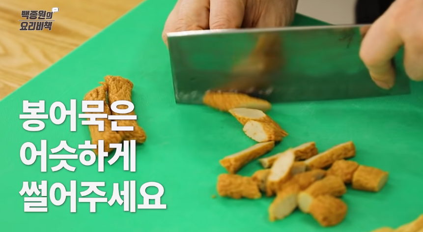1. 얇은 사각 어묵은 길게 반으로 자른 뒤, 두께 2cm 정도로 얇게 썰어주세요. 봉어묵은 약 1cm 두께로 사선으로 썰어 준비합니다.