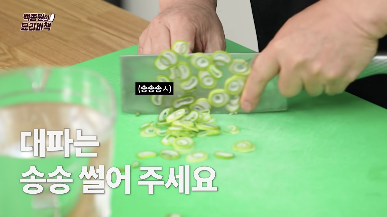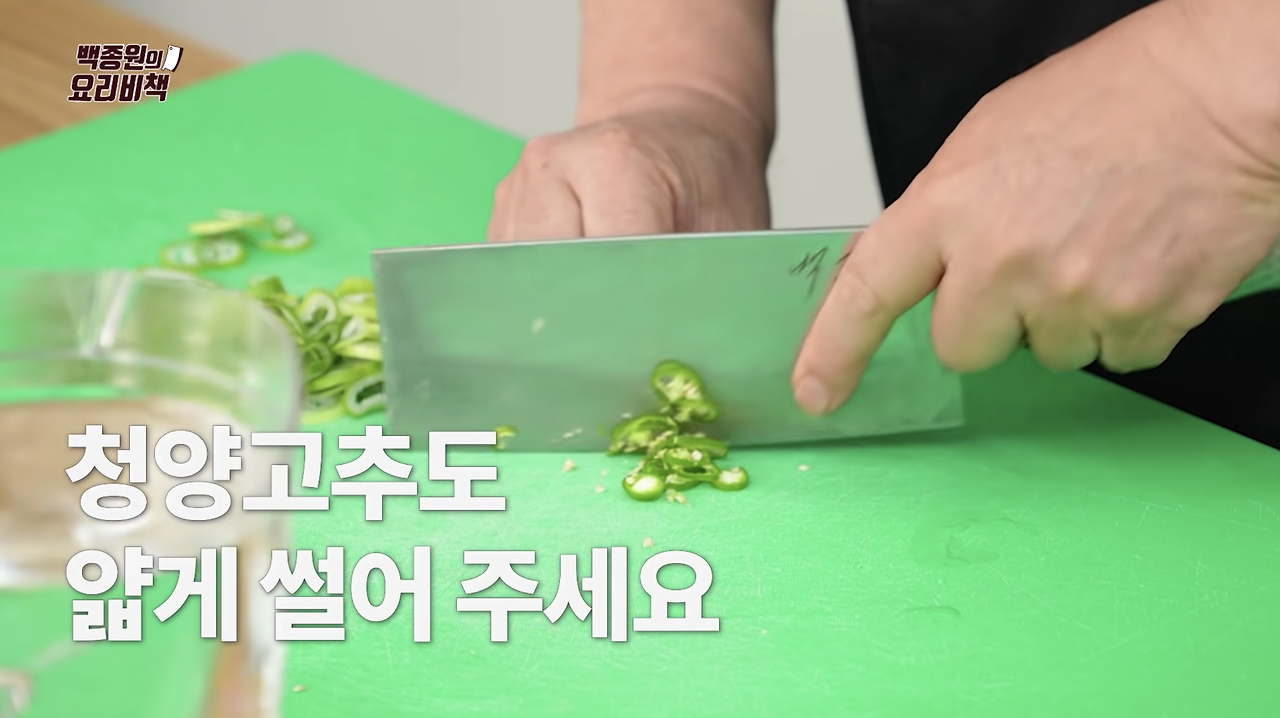 2. 대파와 청양고추는 약 0.3cm 두께로 송송 썰어 준비합니다. 가능하다면 최대한 얇게 썰어주는 것이 좋습니다.